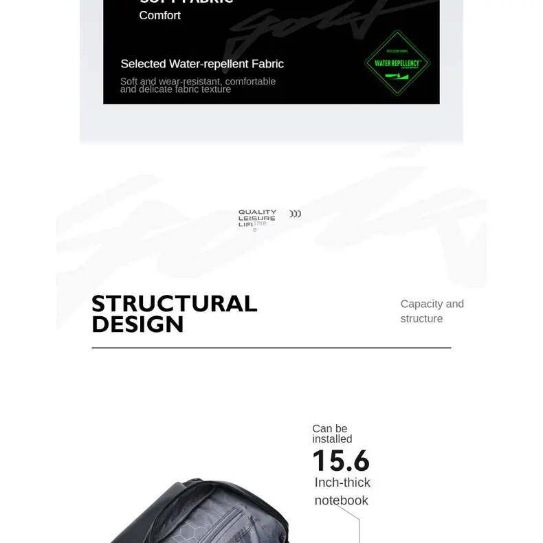 Internal: 1 main compartment, 1 large compartment, 1 zipper pocket, 2 insertion pockets.